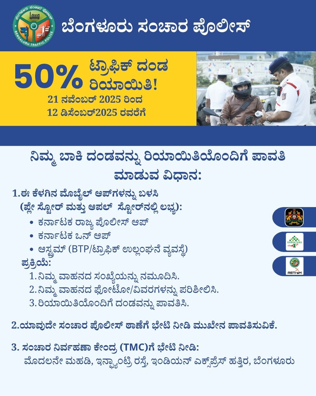 ಬೆಂಗಳೂರು, ನ.21: ರಾಜ್ಯ ಕಾಂಗ್ರೆಸ್ ಸರಕಾರವು ವಾಹನ ಸವಾರರಿಗೆ ಮತ್ತೊಮ್ಮೆ ಸಿಹಿ ಸುದ್ದಿ ನೀಡಿದೆ. ಸಂಚಾರ ನಿಯಮ ಉಲ್ಲಂಘನೆ ಪ್ರಕರಣಗಳಿಗೆ ಆಗಲೇ ಜಾರಿಯಲ್ಲಿದ್ದ ಶೇ.50 ರಷ್ಟು ಟ್ರಾಫಿಕ್ ದಂಡ ರಿಯಾಯಿತಿ ಯೋಜನೆಯನ್ನು ಸರಕಾರ ಮರುಜಾರಿಗೆ ತಂದಿದ್ದು, ಈ ಕುರಿತು ಅಧಿಕೃತ ಆದೇಶ ಹೊರಡಿಸಲಾಗಿದೆ. ರಾಜ್ಯ ಸಾರಿಗೆ ಇಲಾಖೆಯ ಅಧೀನ ಕಾರ್ಯದರ್ಶಿ ರಂಗಪ್ಪ ಕರಿಗಾರ ಸಹಿ ಮಾಡಿದ ಆದೇಶದ ಪ್ರಕಾರ, ನವೆಂಬರ್ 21 ರಿಂದ ರಾಜ್ಯದಾದ್ಯಂತ ಬಾಕಿ ಇರುವ ಸಂಚಾರ ದಂಡಗಳ ಮೇಲೆ 50 ಪರ್ಸೆಂಟ್ ರಿಯಾಯಿತಿ ದೊರೆಯಲಿದೆ. ಈ ವಿಶೇಷ ಅವಕಾಶ ಡಿಸೆಂಬರ್ 12 ರವರೆಗೆ ಮಾತ್ರ ಲಭ್ಯವಿದ್ದು, ವಾಹನ ಮಾಲೀಕರು ಈ ಅವಧಿಯೊಳಗೆ ಬಾಕಿ ಇರುವ ದಂಡಗಳನ್ನು ಕಡಿತ ದರದಲ್ಲಿ ಪಾವತಿಸಬಹುದು.
