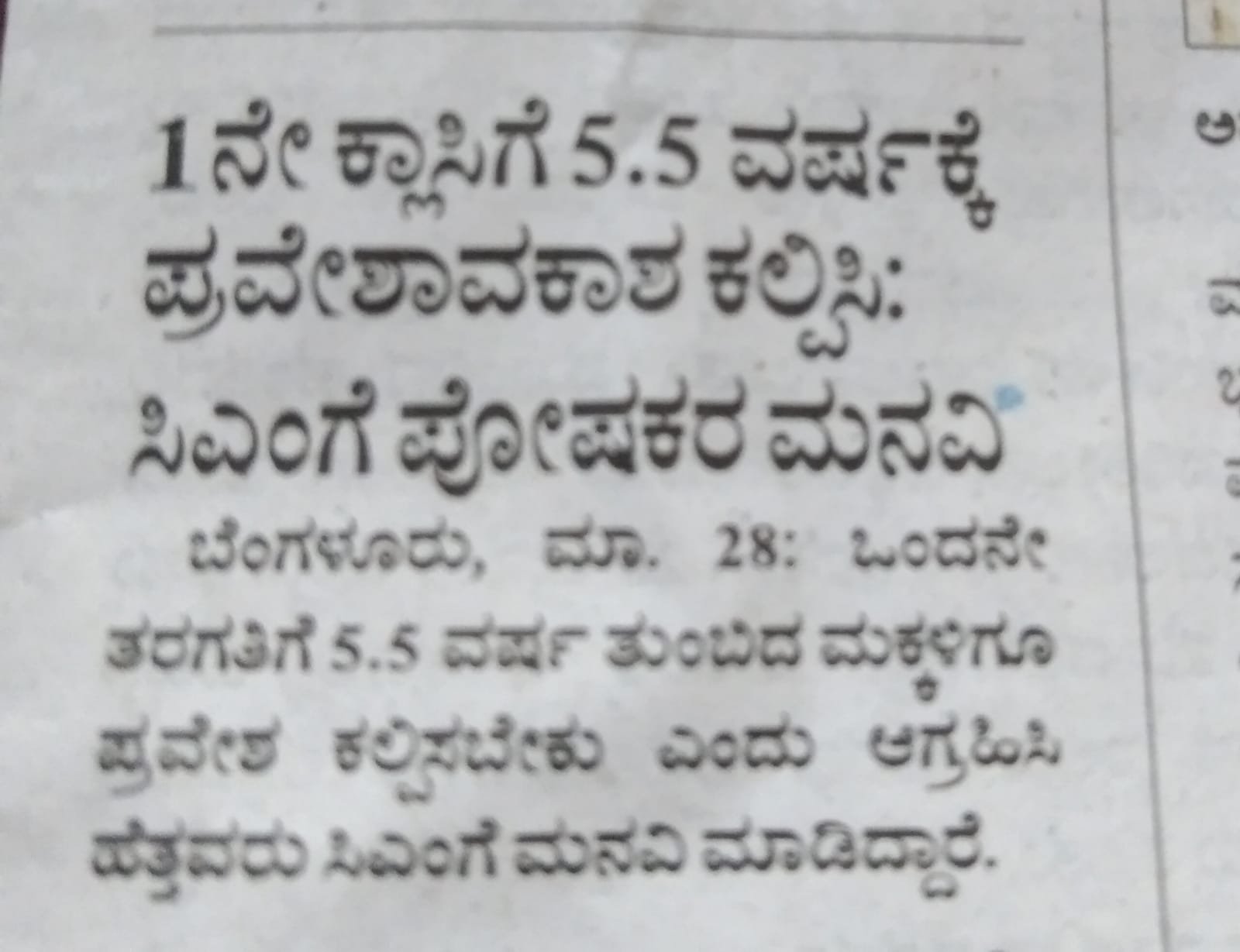 ಪತ್ರಿಕೆಯಲ್ಲಿ ಬಂದ ಇಂತಹ ಸುದ್ದಿ ಓದಿ ಏಕೋ ಮನಸ್ಸಿಗೆ ಪಿಚ್ಚೆನಿಸಿತು. ಒಂದನೇ ತರಗತಿಗೆ 5.5 ವರ್ಷಕ್ಕೆ ಪ್ರವೇಶಾವಕಾಶ ಕಲ್ಪಿಸಿ ಅಂತ ಪೋಷಕರು ಸಿ.ಎಂಗೆ ಮನವಿ ಮಾಡಿದ್ದಾರೆ. ತಿಳುವಳಿಕೆ ಉಳ್ಳವರು ಅಂದಿನ ನಮ್ಮ ಬದುಕನ್ನೂ, ನಮ್ಮ ಮಕ್ಕಳ ಇಂದಿನ ಬದುಕನ್ನೂ ತೂಗಿ ನೋಡಿದಾಗ, ಮಕ್ಕಳ ಬಾಲ್ಯವನ್ನು ಕಸಿಯುತ್ತಿರುವ ಅಪರಾಧೀ ಮನೋಭಾವ ಮೂಡದೇ ಇರಲಾರದು. ಸಾಧಾರಣ ಆರು ವರ್ಷಗಳವರೆಗೂ ತಂದೆ ತಾಯಿಯ ಜೊತೆ, ಅವರೆಲ್ಲಿ ಹೋದರೂ ಹಿಂದೆ ಹೋಗುತ್ತಾ, ಬಿಸಿಲು, ಮಳೆ,ಚಳಿ ಎಂಬ ಯೋಚನೆ ಇಲ್ಲದೇ ಅಲೆದಾಡಿದರೂ, ಜ್ಞಾನ ಸಂಪಾದನೆ ವಿಷಯದಲ್ಲಿ ಹಿಂದೆ ಬೀಳದವರು ನಾವೆಲ್ಲ. ಈಗಲೂ ನಮ್ಮ ಬಾಲ್ಯ ಕಣ್ಮುಂದೆ ಬಂದರೆ ಆಹಾ! ಎನಿಸುವ ಆಹ್ಲಾದ ಭಾವ.