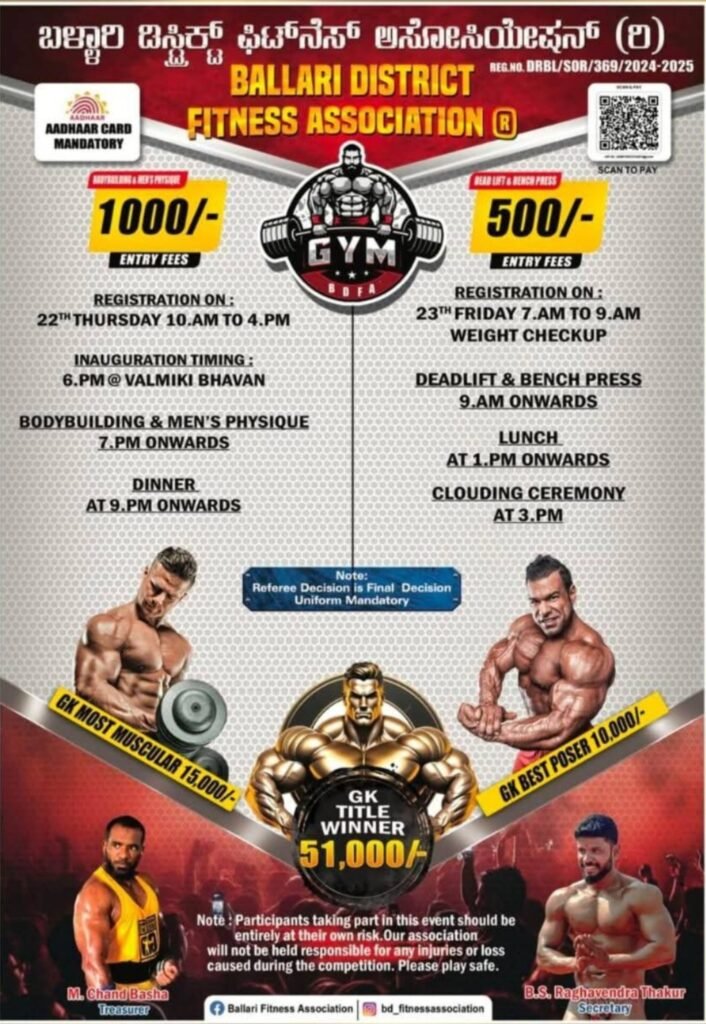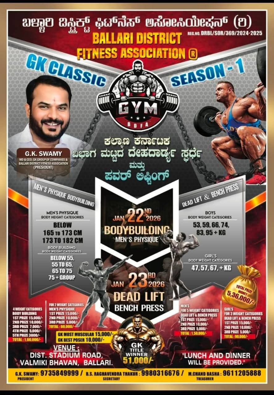 ಬಳ್ಳಾರಿ ಜಿಲ್ಲಾ ಫಿಟ್ನೆಸ್ ಅಸೋಸಿಯೇಷನ್ (ಬಿಡಿಎಫ್‌ಎ) ಆಶ್ರಯದಲ್ಲಿ “ಜಿಕೆ ಕ್ಲಾಸಿಕ್ – ಸೀಸನ್‌–1” ಜಿಮ್ ಮತ್ತು ದೈಹಿಕ ಸಾಮರ್ಥ್ಯ ಸ್ಪರ್ಧೆಯನ್ನು 2026ರ ಜನವರಿ 22 ಮತ್ತು 23ರಂದು ಬಳ್ಳಾರಿಯ ವಾಲ್ಮೀಕಿ ಭವನದಲ್ಲಿ ಭವ್ಯವಾಗಿ ಆಯೋಜಿಸಲಾಗಿದೆ.