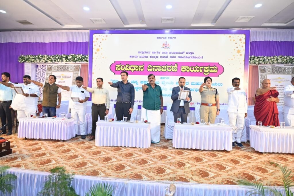 ಬಳ್ಳಾರಿ, ನ. 26: ಜಿಲ್ಲಾಡಳಿತ ಮತ್ತು ಜಿಲ್ಲಾ ಪಂಚಾಯತ್ ಬಳ್ಳಾರಿ ಹಾಗೂ ಸಮಾಜ ಕಲ್ಯಾಣ ಇಲಾಖೆ ಬಳ್ಳಾರಿ ಇವರ ಸಹಯೋಗದಲ್ಲಿ ಸಂವಿಧಾನ ದಿನಾಚರಣೆ ಬಳ್ಳಾರಿಯ ಶ್ರೀ ಮಹರ್ಷಿ ವಾಲ್ಮೀಕಿ ಭವನದಲ್ಲಿ ಬುಧವಾರ ನಡೆಯಿತು.