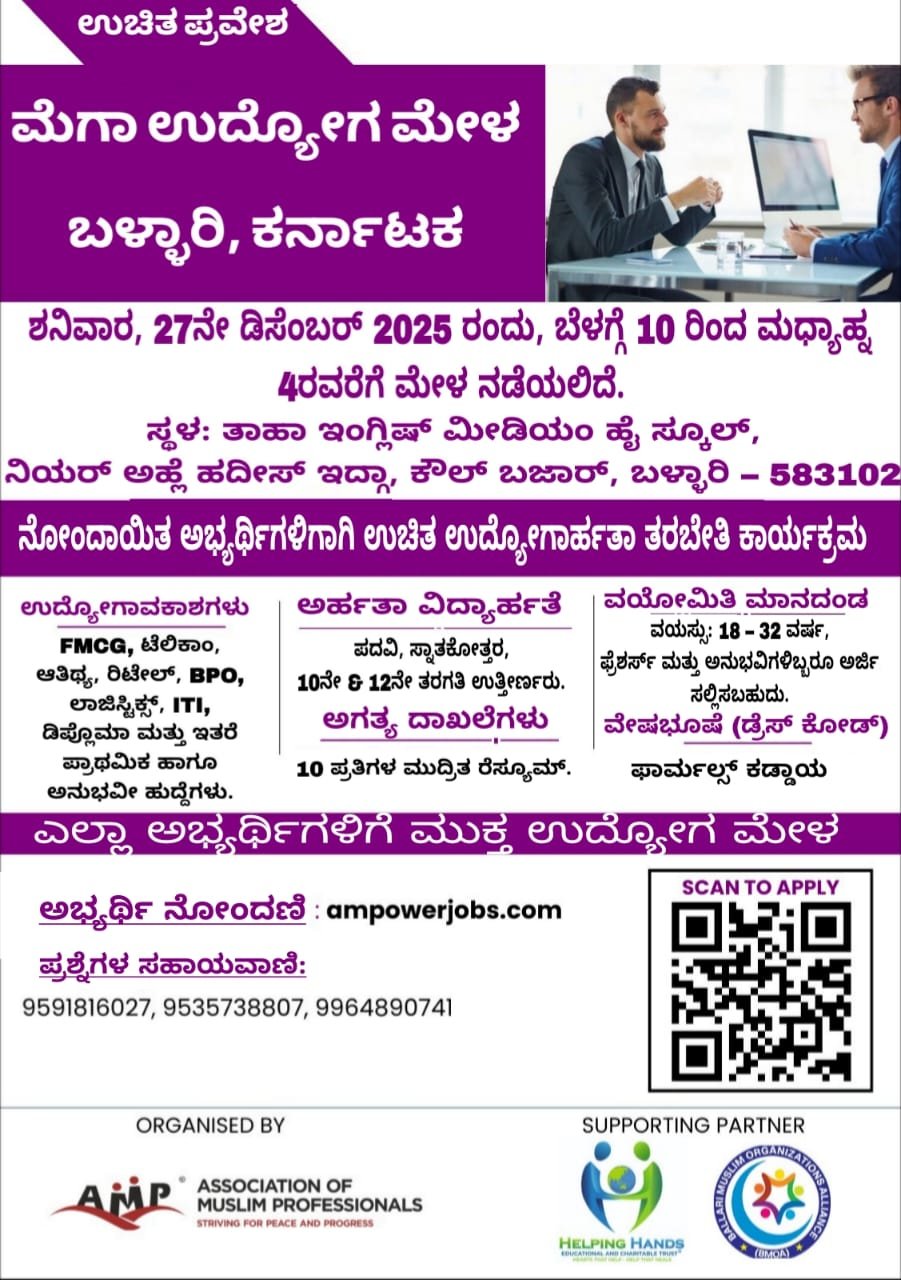 ಈ ಉದ್ಯೋಗ ಮೇಳವನ್ನು ಅಸೋಸಿಯೇಷನ್ ಆಫ್ ಮುಸ್ಲಿಂ ಪ್ರೊಫೆಷನಲ್ಸ್ (AMP) ಆಯೋಜಿಸಿದ್ದು, ಹೆಲ್ಪಿಂಗ್ ಹ್ಯಾಂಡ್(H.H) ಸೇರಿದಂತೆ ಹಲವು ಸಂಸ್ಥೆಗಳು ಸಹಭಾಗಿತ್ವ ನೀಡಿವೆ. ಹೆಚ್ಚಿನ ಮಾಹಿತಿಗಾಗಿ ನೋಂದಣಿ ಲಿಂಕ್ ಅಥವಾ ಕ್ಯೂಆರ್(QR) ಕೋಡ್ ಮೂಲಕ ಅರ್ಜಿ ಸಲ್ಲಿಸಬಹುದು ಎಂದು ತಿಳಿಸಲಾಗಿದೆ.